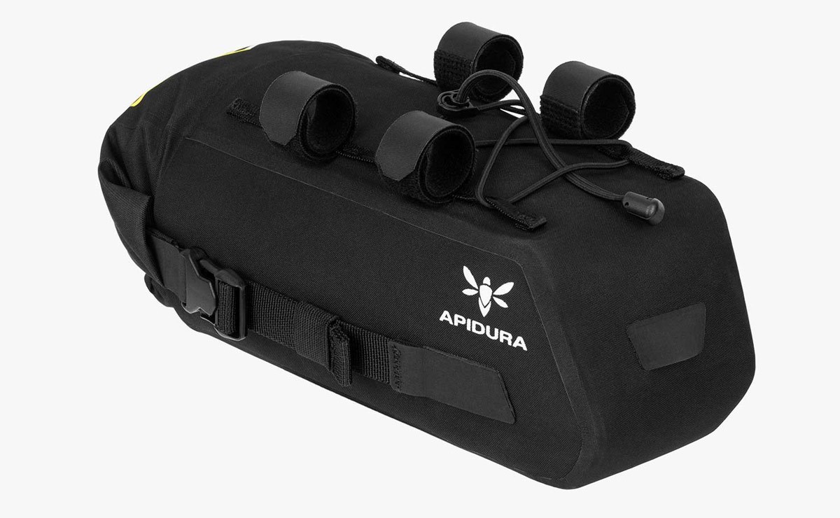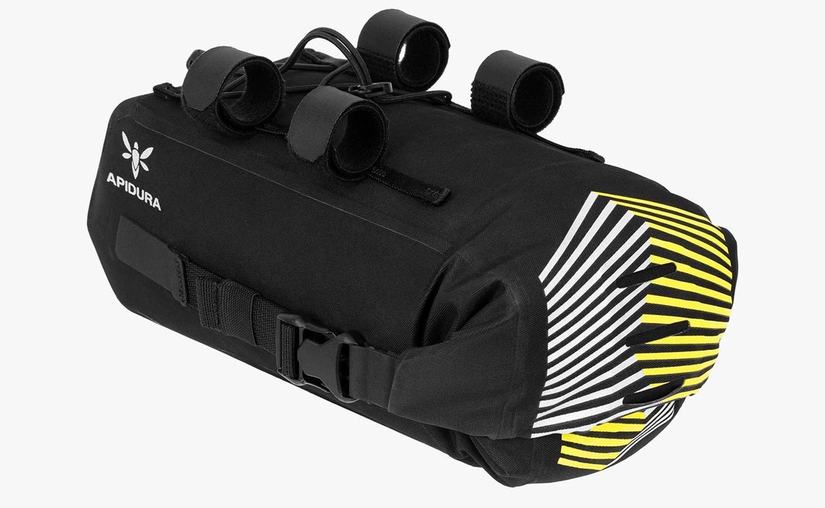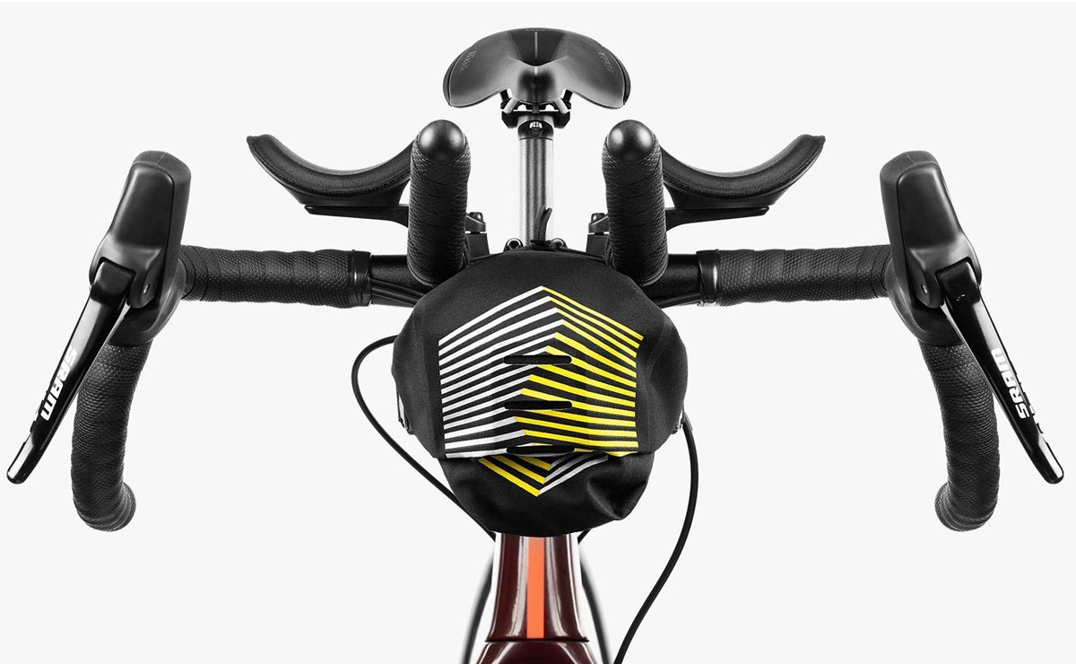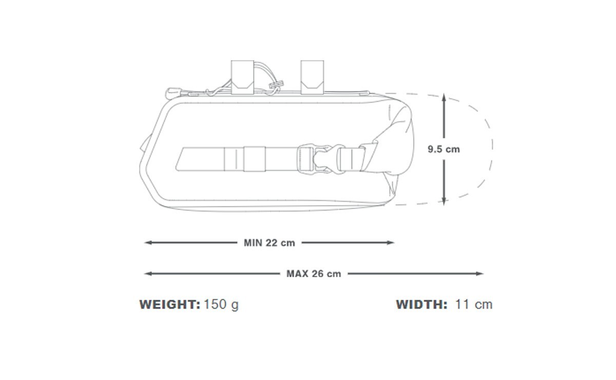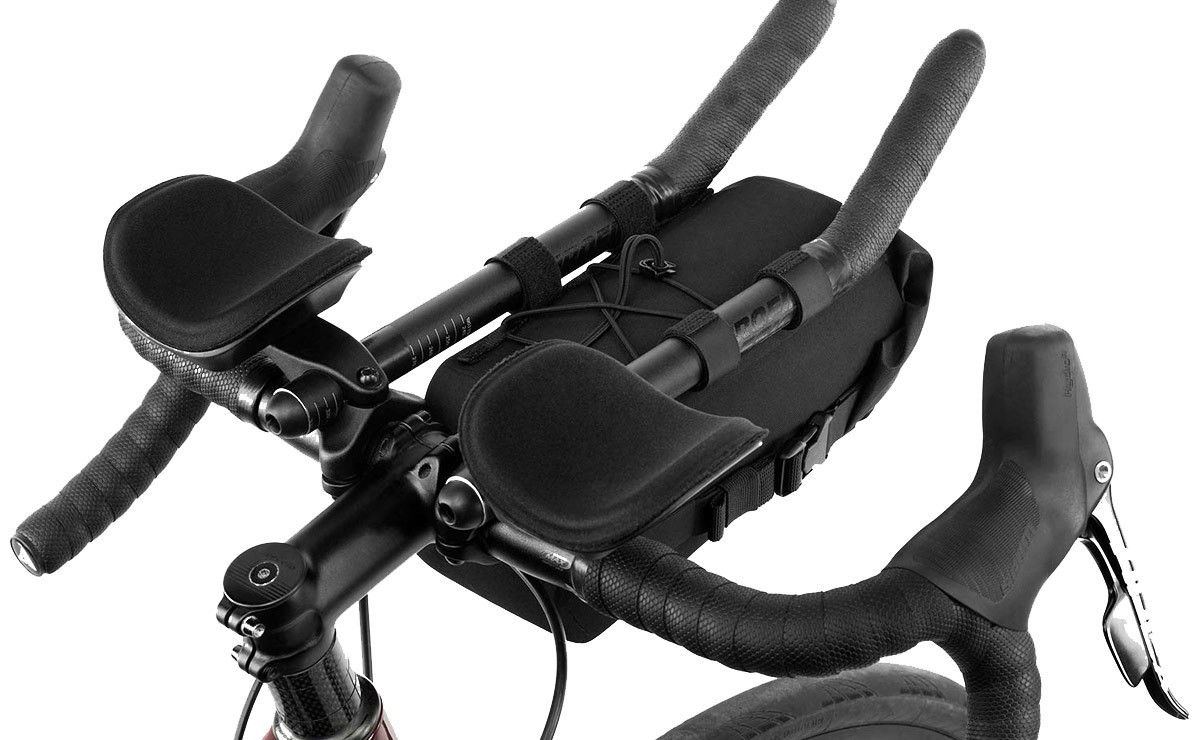 A customisable attachment system ensures this pack is compatible with all bikepacking aero bars and an adjustable bungee tie down creates additional space between the aero bars for items that require quick access. The roll down closure provides flexible carrying capacity while minimising the aero bar bag’s front profile and maintaining its slim design.