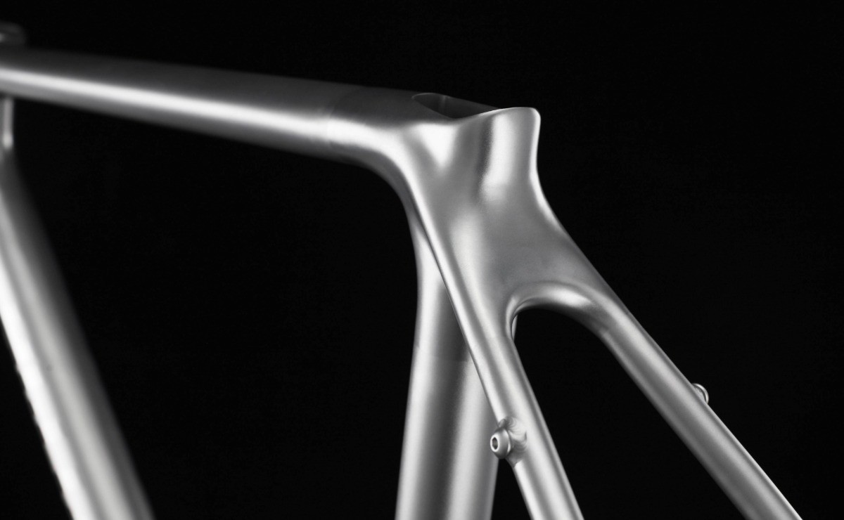 Základem rámu jsou hydroformované a zeslabované titanové trubky, které nabízejí ideální poměr nízké hmotnosti, vysoké tuhosti a odolnosti. Tyto trubky jsou plynule propojeny se sadou 3D tištěných titanových komponentů – od patek přes středové pouzdro až po hlavovou trubku a spoj sedlových vzpěr. Tento výrobní postup umožňuje dosáhnout maximální přesnosti, optimálního rozložení sil a zároveň snížit celkovou hmotnost rámu.